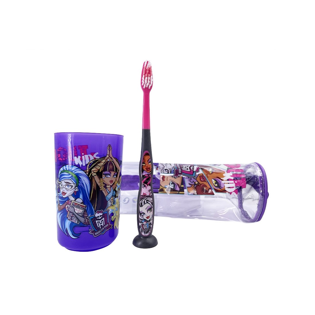 Le kit 3 pièces Monster High contient : un gobelet, une brosse à dents souple et une trousse de toilette.
