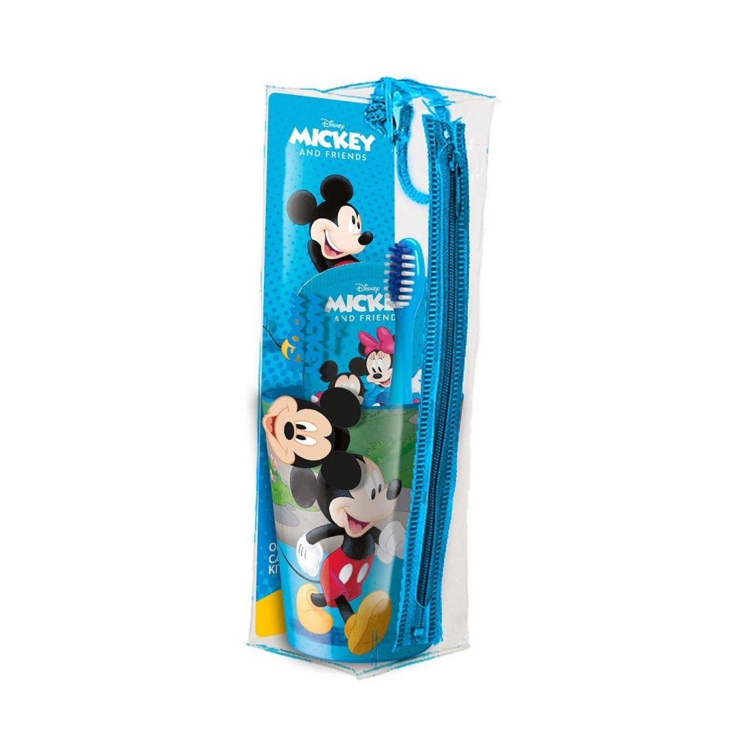 Le kit 4 pièces Mickey contient : un gobelet, une brosse à dents souple, un dentifrice menthe douce et une trousse de toilette.
