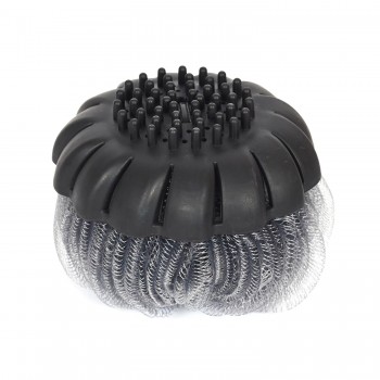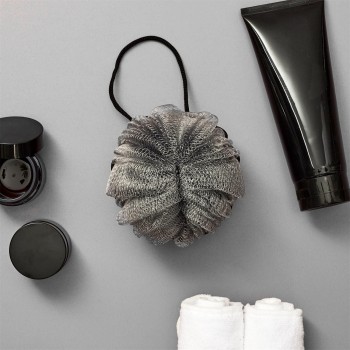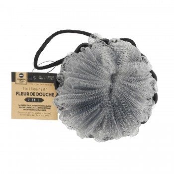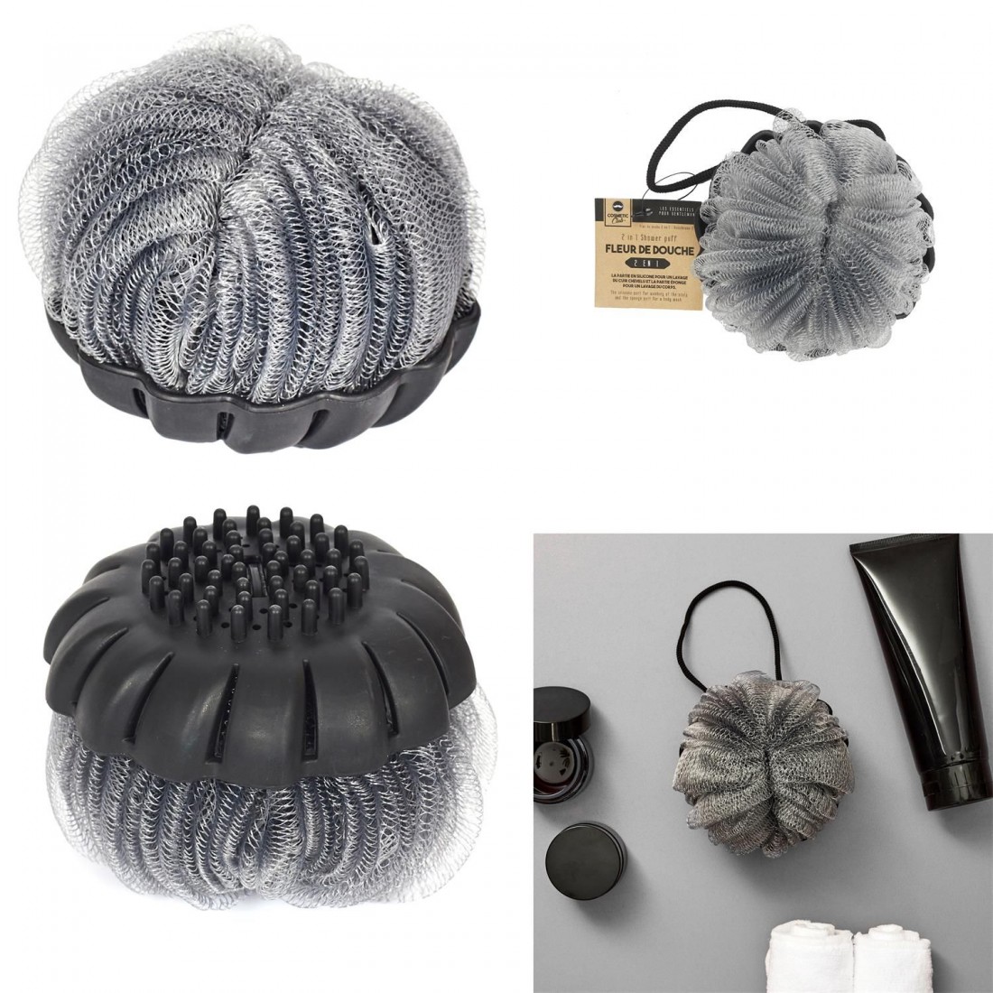 Elle présente des picots pour le massage du cuir chevelu et un filet pour le lavage du corps.