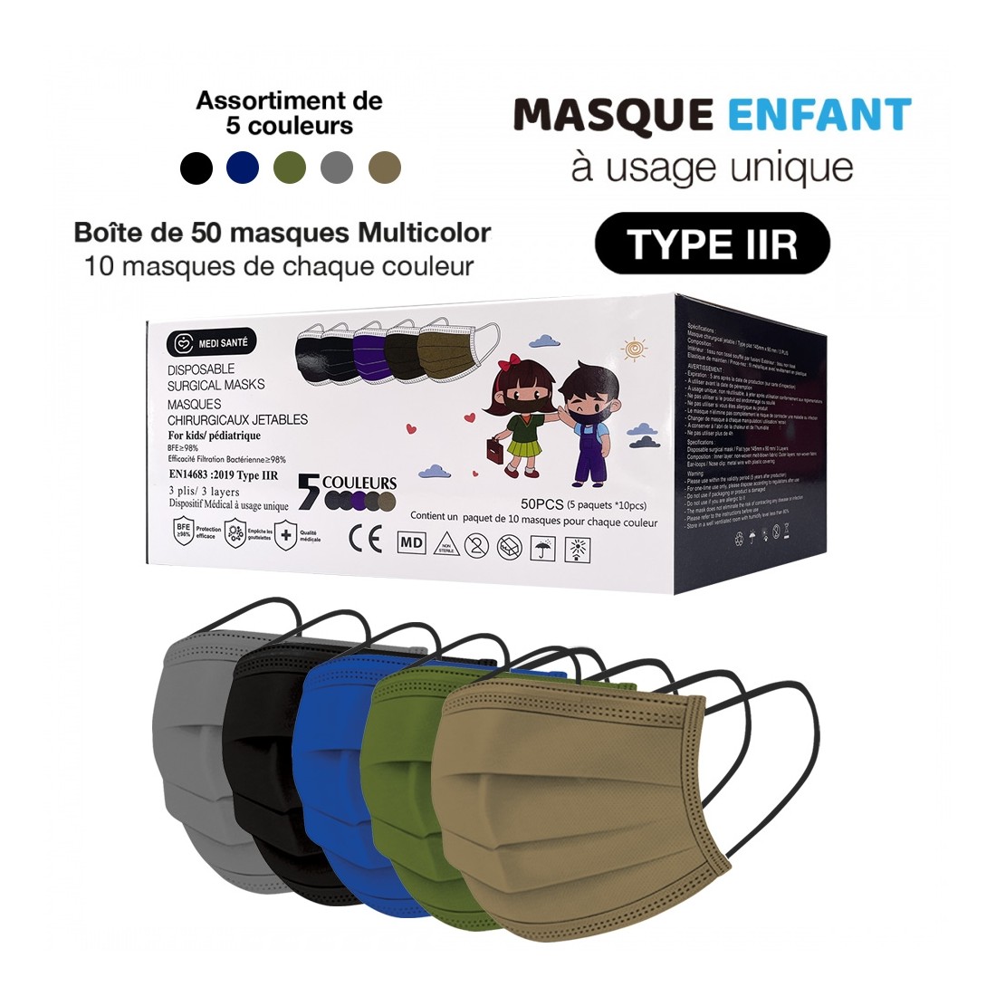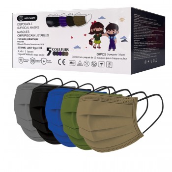 5 couleurs de masque sont disponible par boite : Noir, gris fonçé, bleu marine, Kaki, gris taupe.