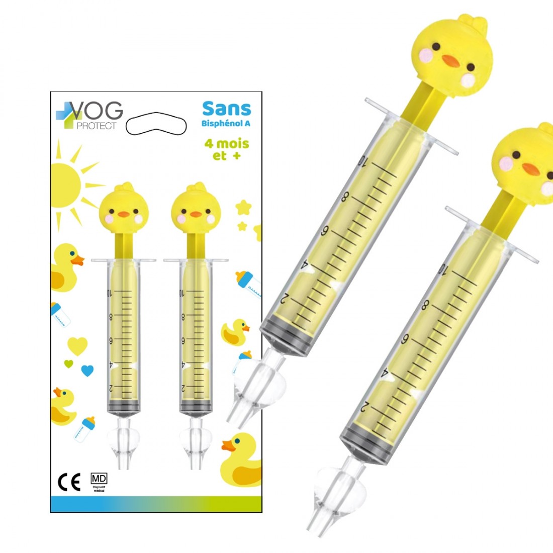 Pack de 2 seringues nasales 10ml motif Canard permettant de nettoyer le nez des bébés à l'aide de sérum physiologique.